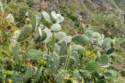 Close-up view of a cactus plant set against the scenic and dramatic Andes Mountains along the Chicaqata Hike near Ollantaytambo, Peru.