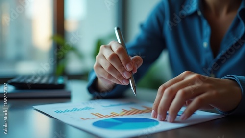 Close-up view of a person analyzing charts and graphs on a desk, highlighting the focus on business data analysis and careful consideration.