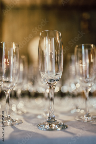 close-up view of champagne glasses prepared for a celebration. Soft background blur and warm lighting highlight transparency and elegance, perfect for festive or luxury concepts.
