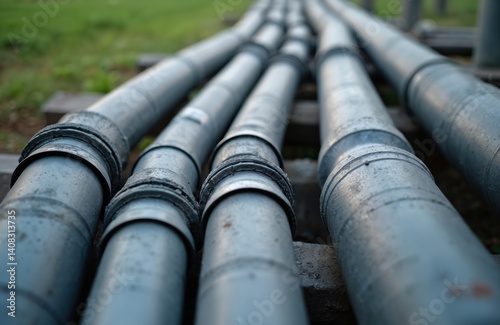 Close-up view of exterior heating pipes in urban environment. Industrial pipeline system runs along street supplying hot water gas. Infrastructure industry for supply. Construction of communication