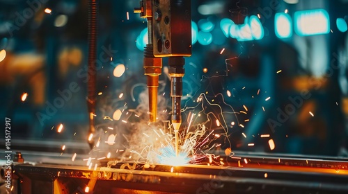 Close-Up View of Welding Torch with Sparks in Action, Concept of Industrial Craftsmanship, Metalwork Expertise, Fiery Art of Welding and Machinery Precision