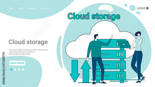 Cloud storage.People store their data on the cloud.Modern data storage system.An illustration in the style of a landing page in green.