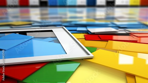 Cluttered visual of numerous, colorful flat folders scattered across reflective floor, each at various angles. Image conveys overwhelming information or choice, using bright primary colors