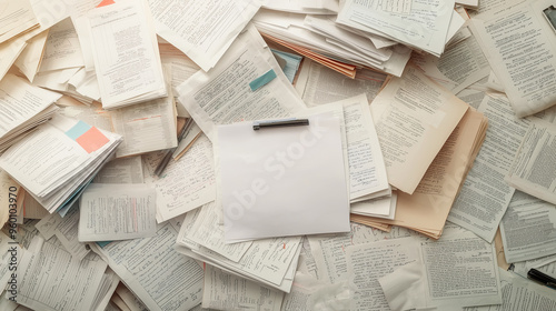 cluttered workspace with a large pile of paperwork and documents, capturing the essence of bureaucracy and the chaos of financial reporting. The copy space for text provides flexib