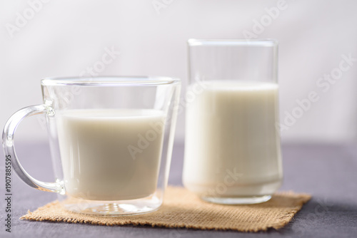 Cold organic milk in a glass for a healthy breakfast