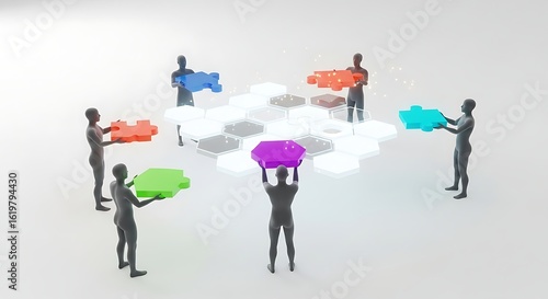 Collaborative Puzzle Solution: Hexagonal Platform, Diverse Team, 3D Render