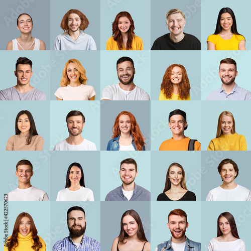 Collage of millennial people portraits with smiling faces, blue backgrounds