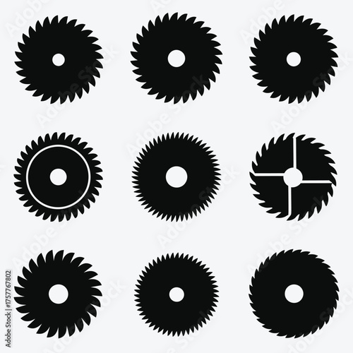 Collection of black circular saw blades on white background