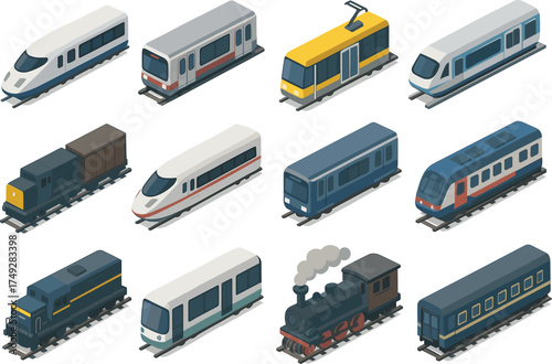 Collection of isometric trains and rail vehicles