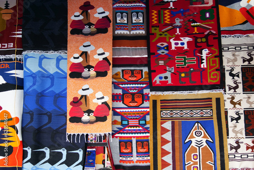 Colorful traditional woven carpets for sale at Otavalo market in Ecuador