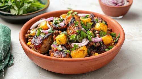 Colorful Bowl of Grilled Chicken Salad with Fresh Herbs and Vegetables on a Light Background