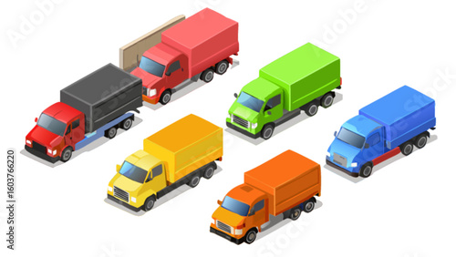Colorful delivery trucks isometric vector illustration freight transport logistics cargo service commercial vehicle 3d