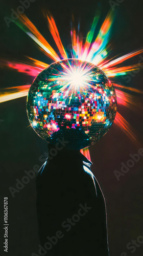 Colorful disco ball head with radiant light burst