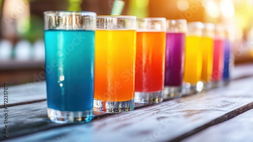 Colorful drinks lined up on a wooden table in a sunny outdoor setting