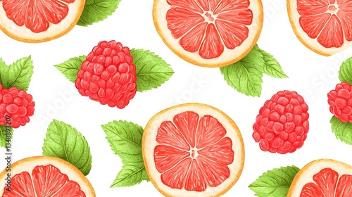 Colorful graphic pattern of grapefruit raspberries and leaves