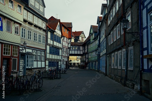 Colorful half-timbered houses line a quiet pedestrian street in the old town of Wolfenbüttel, Germany.