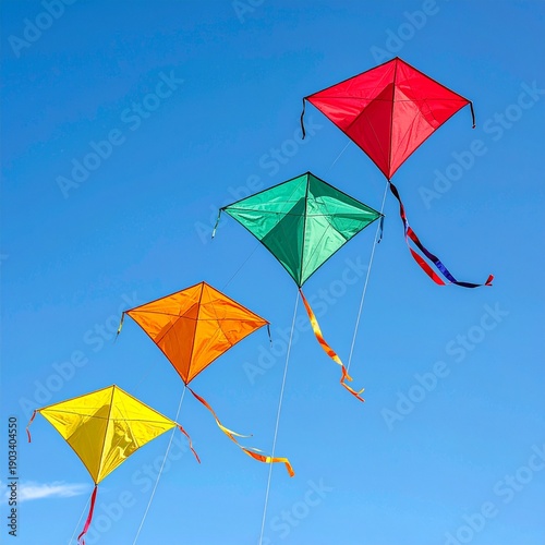 Colorful paper kites flying in clear blue sky, no people, minimal composition, summer daylight, childhood dreams and freedom concept, International Children’s Day, copy space, high resolution.