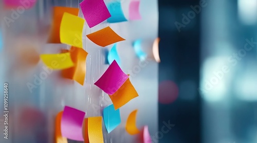 Colorful Sticky Notes Sticking to a Glass Board Abstract Background in Soft Focus Ideal for Creative Workspace or Brainstorming Sessions