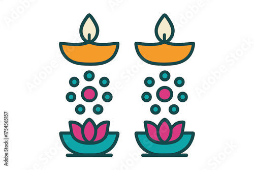 Colorful traditional Indian Diya lamps with burning flames and decorative lotus flower elements for religious holiday celebration