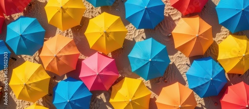 Colorful umbrellas arranged in a vibrant overhead view.