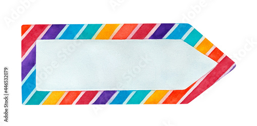 Colorful water color arrow with striped pattern of rainbow colors: red, orange, yellow, teal, light blue and purple. Handdrawn graphic illustration, cut out clip art element for design decoration.