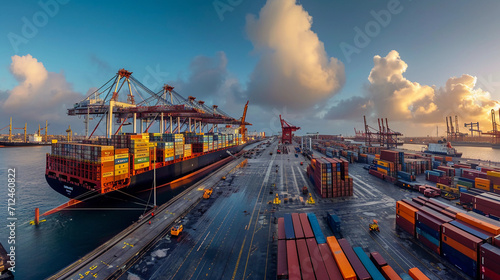 commercial shipping dock, with large cargo ships being unloaded by massive cranes, containers lined up, and workers in high-visibility vests