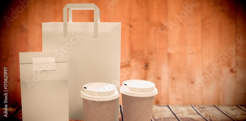 Composite image of disposable coffee cups and parcel bags