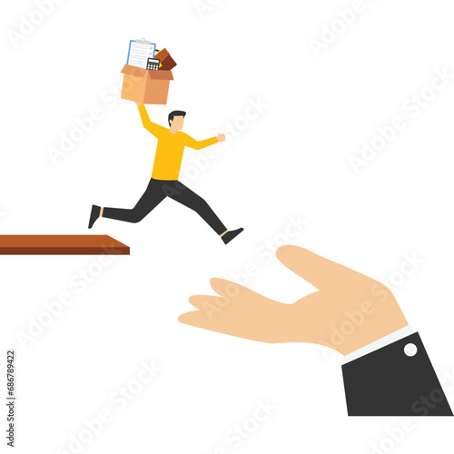 Concept Change job, leave the company for a new career opportunity, confident brave businessman carrying stuff running away jumping from cliff to help giant hand, the decision to change employer conce