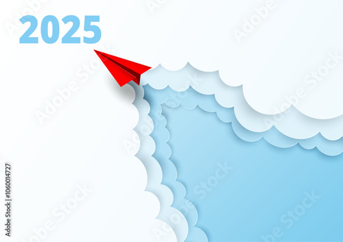 Concept for Planning Success Goals for 2025. Red Paper Plane Flying Toward Success in 2025. paper art style. vector. illustration.