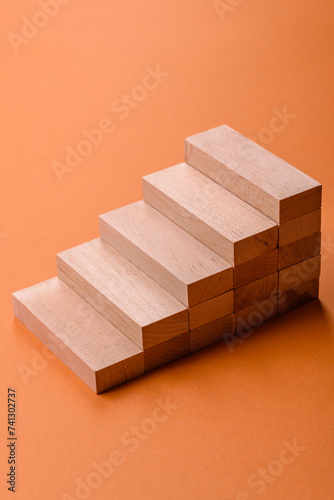 Conceptual composition of wooden steps with coins, model of a house