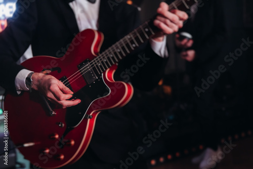 Concert view of an electric guitar player with vocalist and rock band performing in a club, male musician guitarist on stage with audience in a crowded concert club hall arena, hands on a guitar