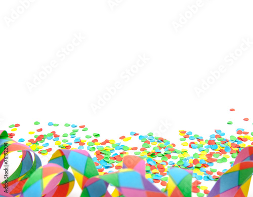 Confetti and party streamer on white background