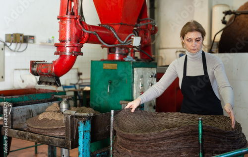 Confident workwoman stacking fiber mats with milled olive paste, preparing to press in handicraft olive oil producing factory..