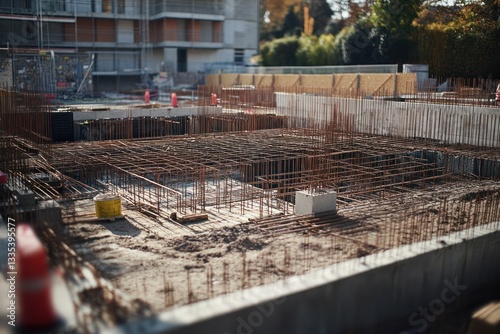 Construction site with rebar framework and foundation