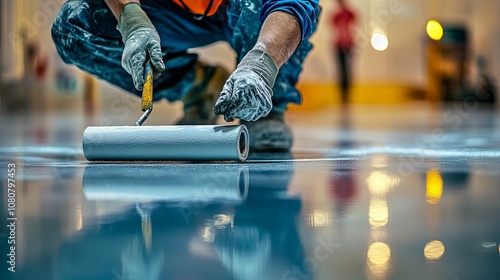 Construction Worker Applying Epoxy Coating to a Floor