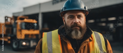 Construction worker on site, a man with a beard in a vest and helmet against the background of a truck