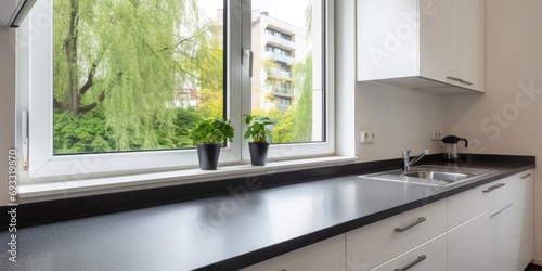 Contemporary apartment kitchen with bright window, white cabinets, and black countertop.