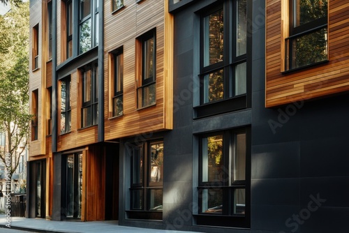 Contemporary architectural design showcases a harmonious combination of wooden elements and dark materials, set against an urban backdrop bathed in daylight