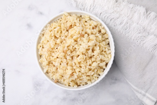Cooked bulgur in bowl on white marble table, top view