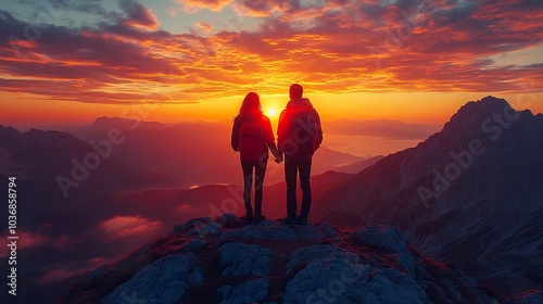 Couple enjoying the sunset from a mountain peak, showcasing a romantic and scenic moment amidst nature's beauty. Ideal for travel blogs, romantic websites, and social media content.