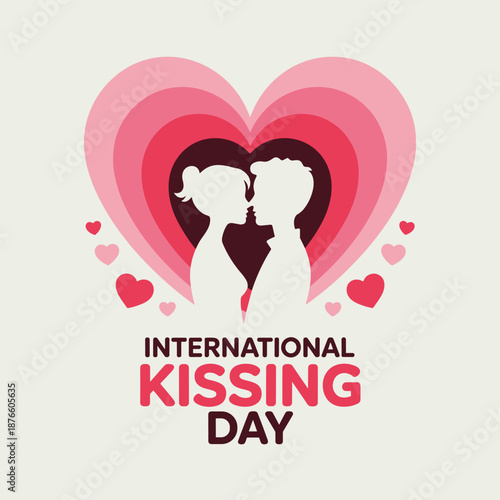 Couple silhouette kissing inside layered pink hearts International Kissing Day