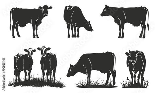 Cows silhouettes set grazing on meadow. Farm animal. Various poses and angles. Dairy product packaging elements. Isolated monochrome vector clipart collection