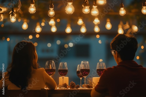 Cozy Evening with Romantic Ambiance, Soft Candlelight, and Glowing String Lights Highlighting a Couple Enjoying Wine together in an Intimate Setting