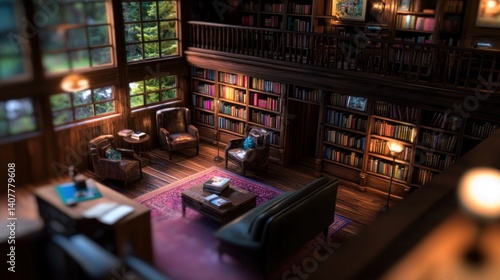 Cozy library interior, reading chairs, wooden bookshelves, forest view
