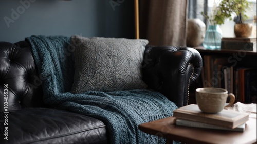 Cozy living room with a black leather sofa in the center. the sofa has a tufted backrest and is covered with a blue throw blanket.