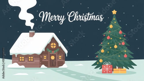 Cozy snow covered cabin with christmas tree and gifts under a starry night sky