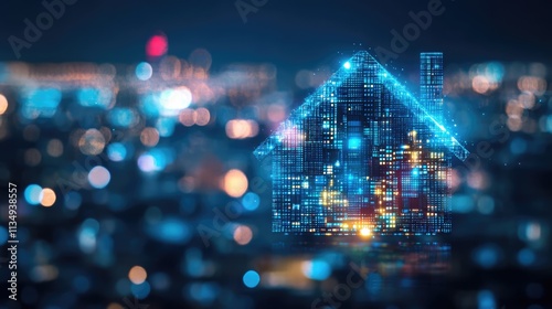 Creative hologram of a smart house with bright digital elements overlaid on a blurred cityscape at night, illustrating artificial intelligence and virtual assistant themes, technology, innovation, urb