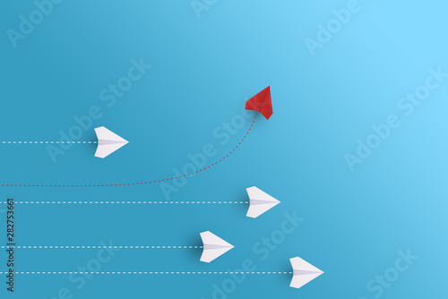 Creative paper planes on blue background. Leadership and success concept.group of white paper planes in one direction and one red paper plane pointing in different way.