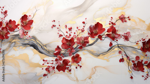 Crimson blooms ornate golden strokes on white canvas