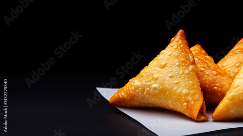 Crispy golden samosas on white paper against dark background, showcasing their delicious texture and shape. Perfect for appetizers or snacks